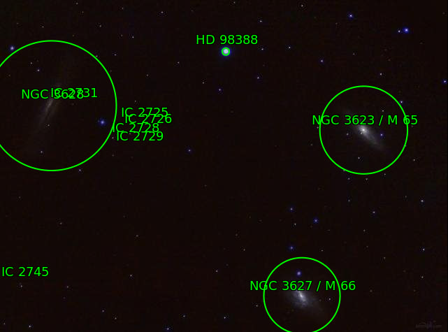 The three large spiral galaxies can be seen in a single field of view and are well viewed even in small telescopes. Their galactic disks are tilted at different angles when seen from Earth. NGC 3628 appears edge-on, while M65 and M66 are inclined enough to reveal their spiral arms.